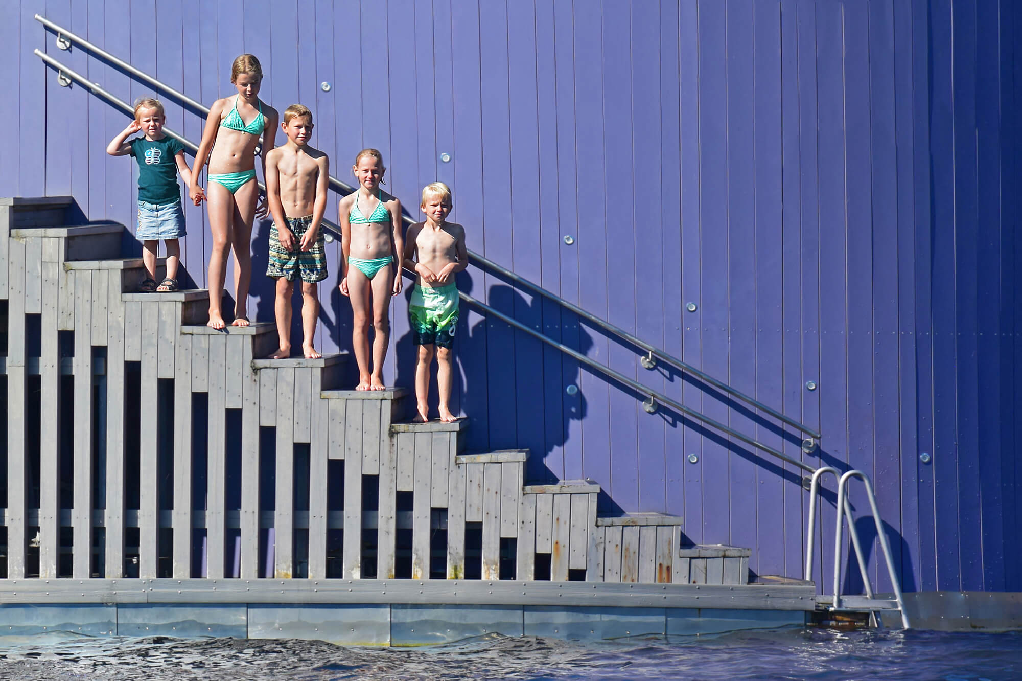 • Egy tóparton kialakított ingyenes szabadtéri strandon egy ötgyerekes család csemetéi. Négyen ugrani készülnek.