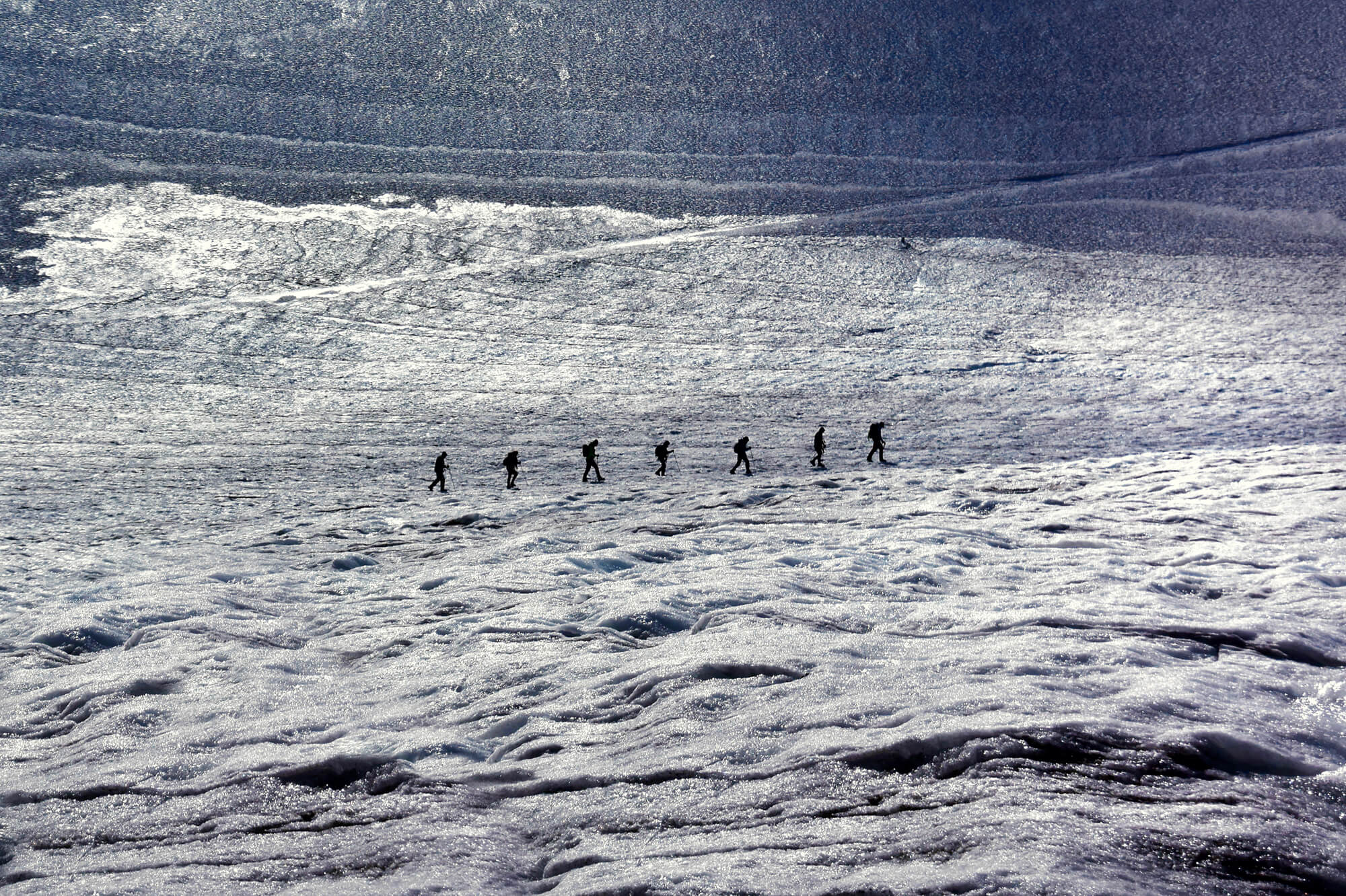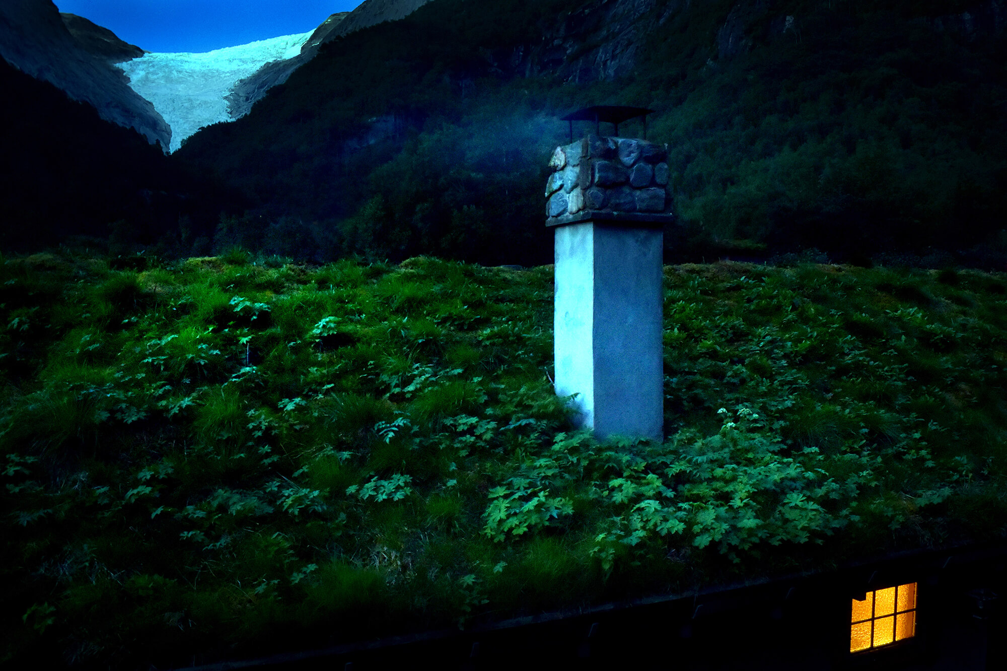 • Egy fű tetejű ház. Bent már begyújtották a kandallót, mert füstöl a kémény. Otthon vannak, mert ég az ablak. Háttérben egy gleccser.